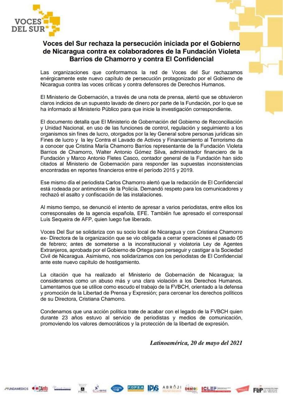 A través de un comunicado, las organizaciones que conforman la red Voces del Sur manifestaron su rechazo a "este nuevo capítulo de persecusión protagonizado por el Gobierno de Nicaragua contra las voces críticas y contra defensores de Derechos Humanos".